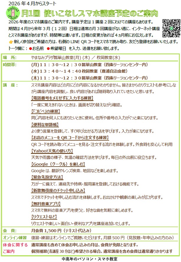 スマホ講座のご案内です期間は2027年3月(月1回)