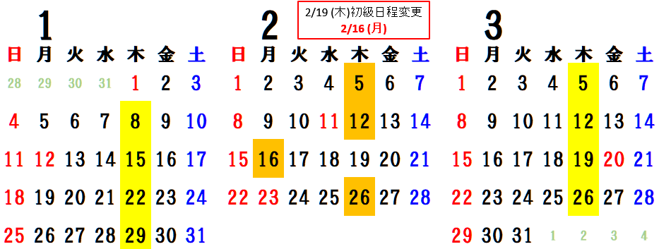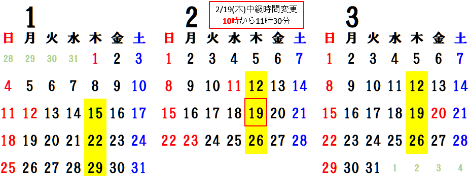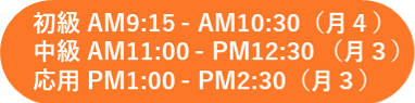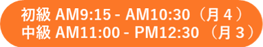| ●木曜クラス2月19日(木) 日程・時間変更● 初級:2/19(木) → 2/16 (月) 9:15 に日程を変更 中級:2/19(木) 11:00 → 10:00 に開始時間を変更 |